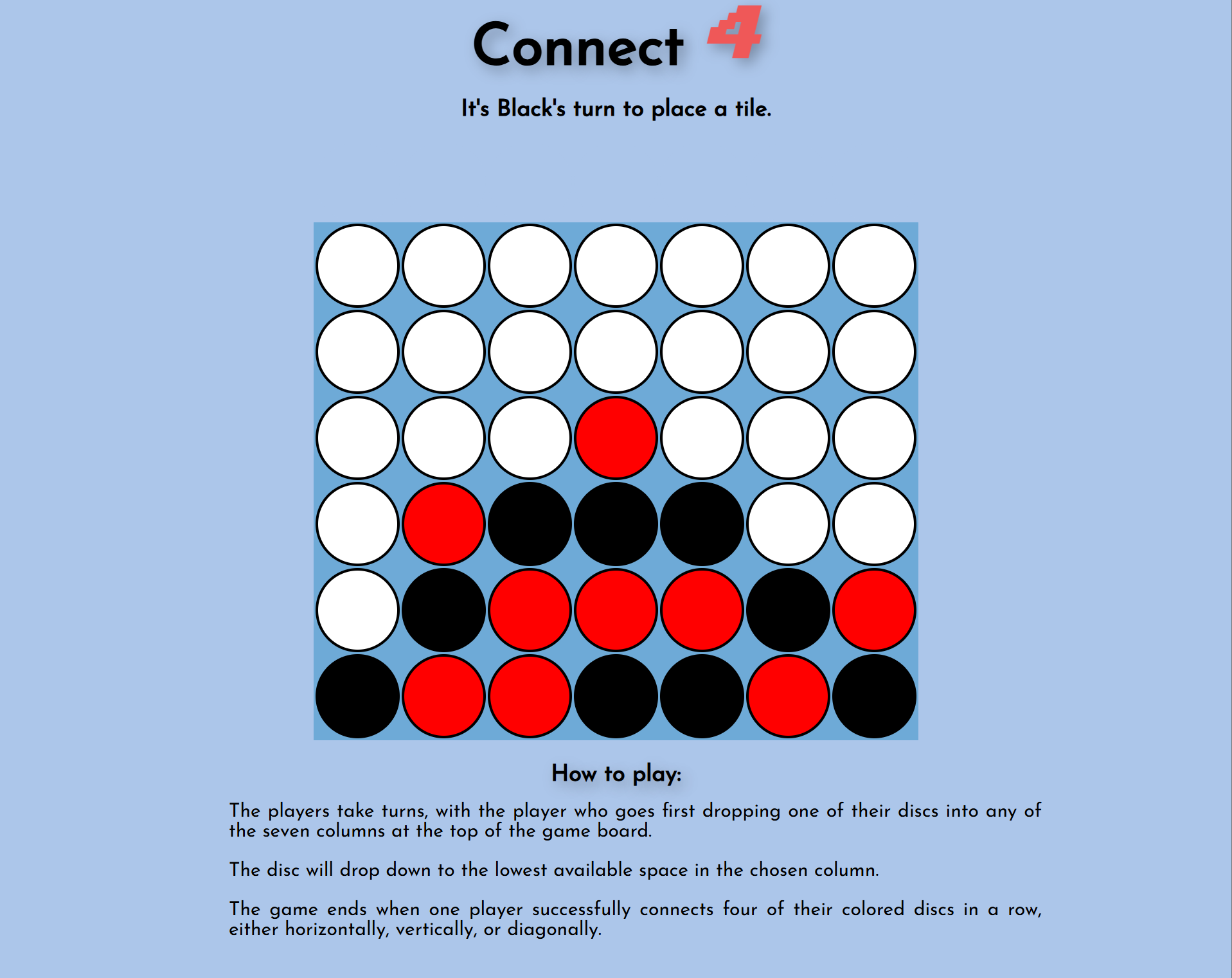 The game ends when one player successfully connects four of their coloured discs in a row, either horizontally, vertically, or diagonally.